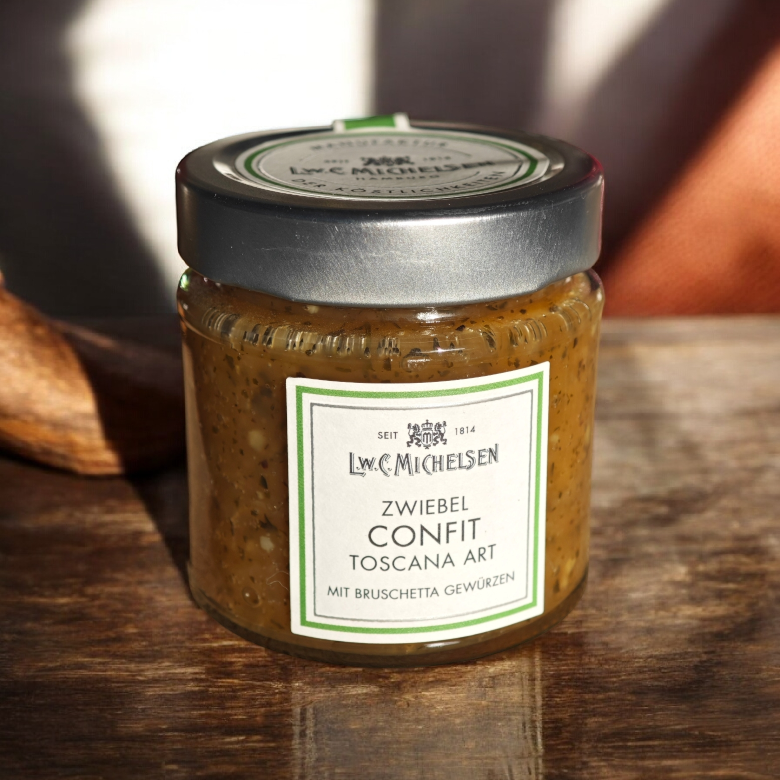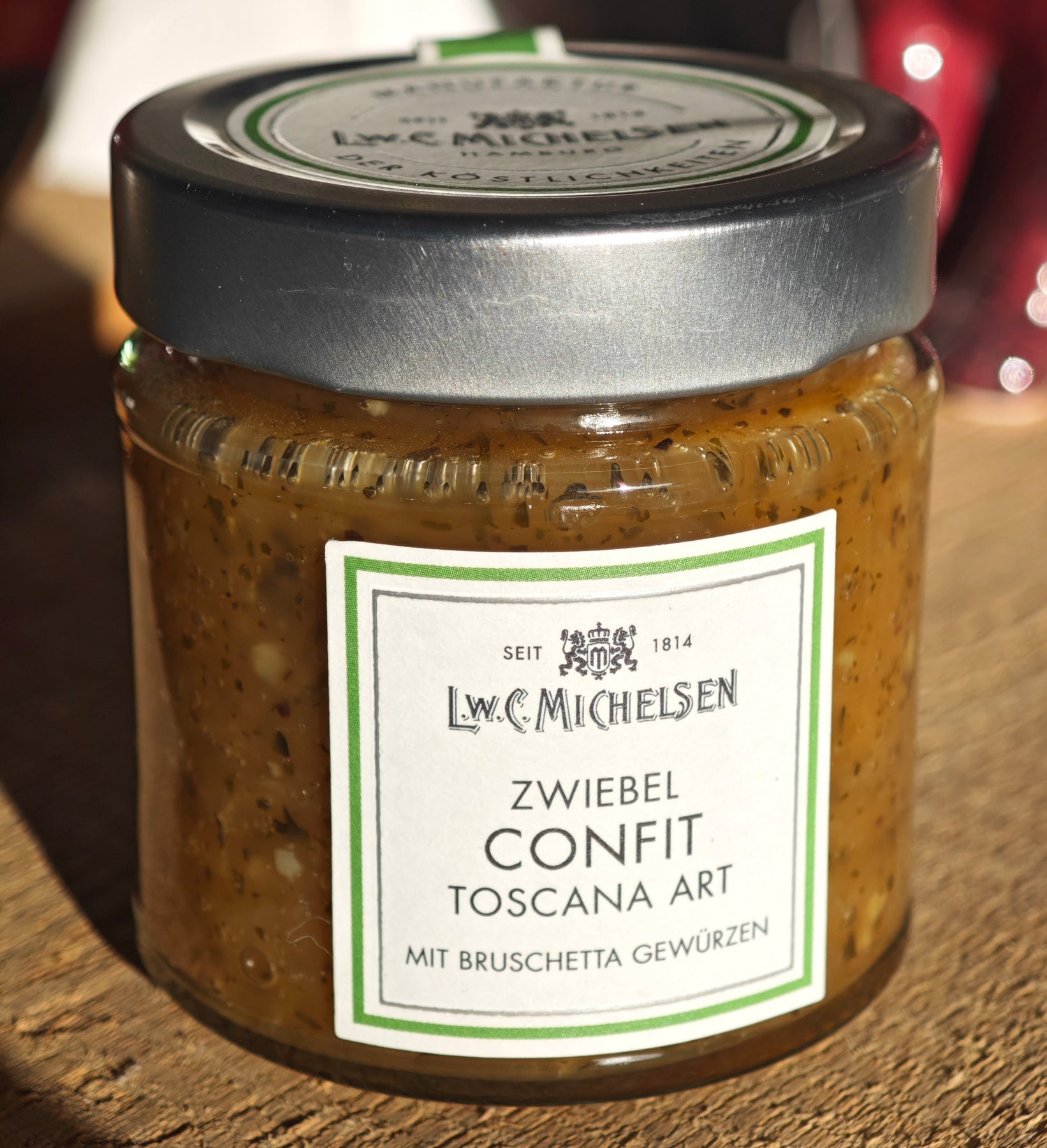 52% frische Zwiebeln, Zucker, 5% Honig, modifizierte Stärke, 1,5% Toskanische Bruschetta Gewürzmischung, Speisesalz,Olivenöl, Säuerungsmittel Zitronensäure, Geliermittel Pektin, Antioxidationsmittel Ascorbinsäure, natürliches Aroma.