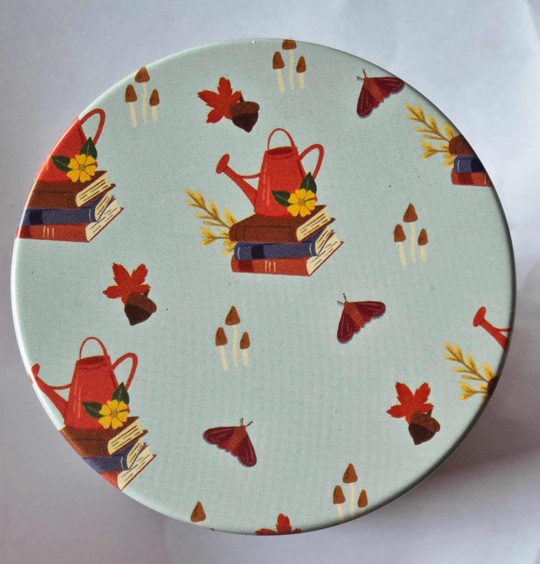 Der Deckel ist cremefarben mit schönem Herbstmotiv.