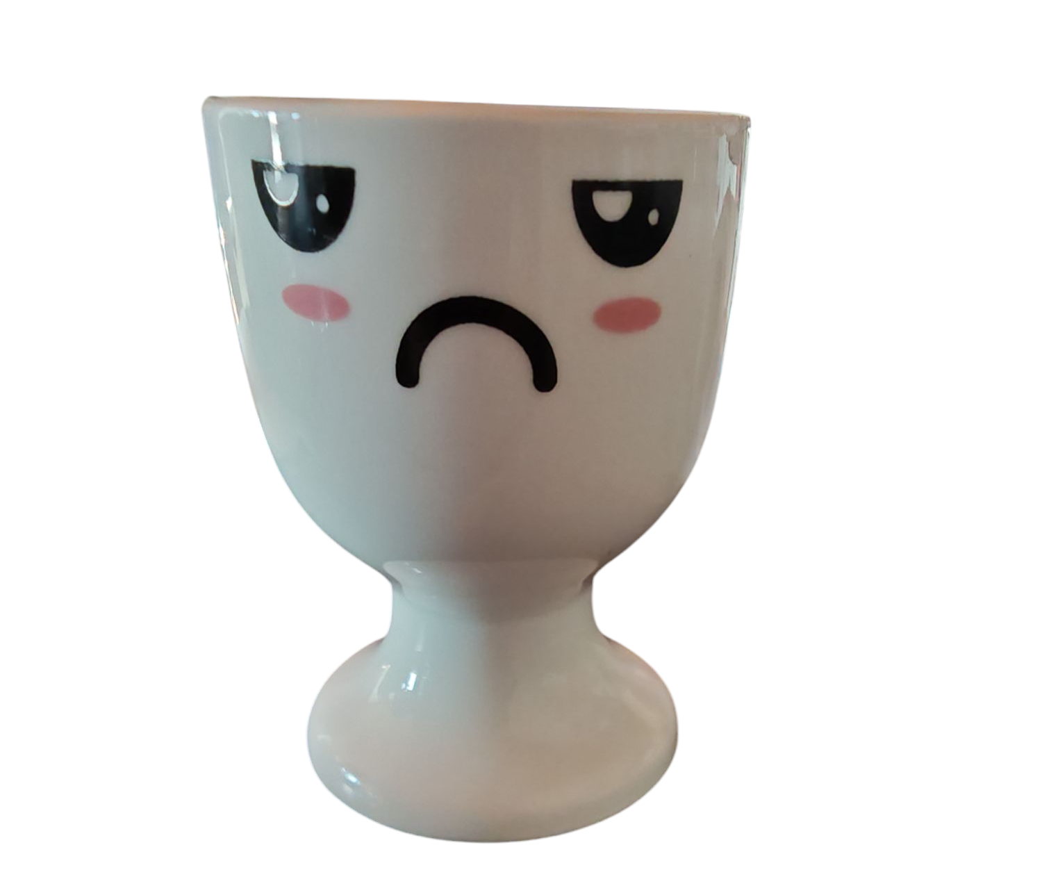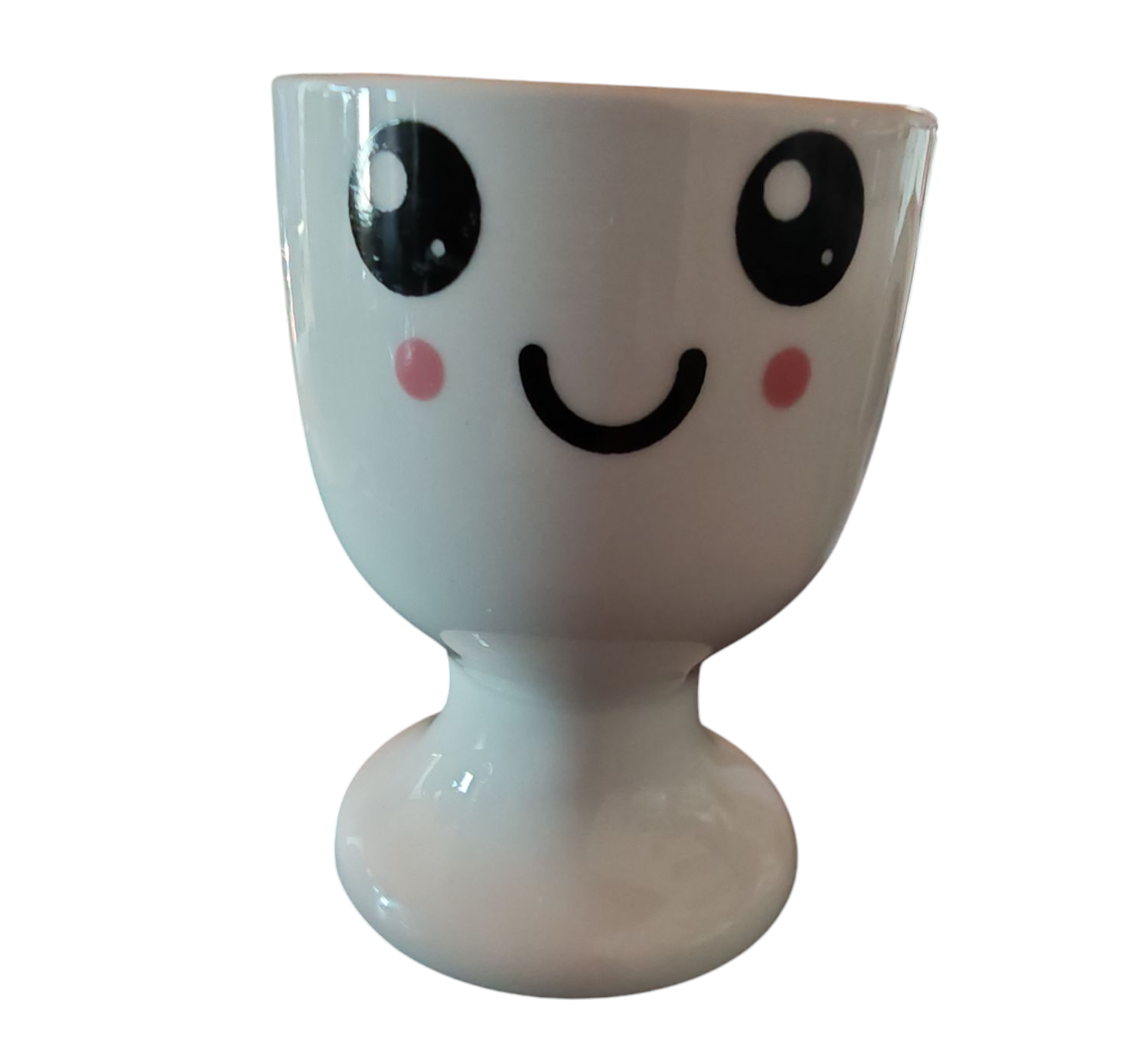 Eierbecher , weiß mit 2 Gesichtern "gut gelaunt / Morgenmuffel"