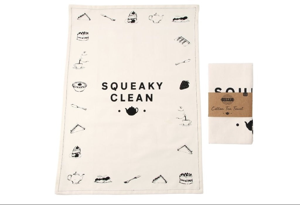 Geschirrtuch mit Beschriftung "Squeaky clean "