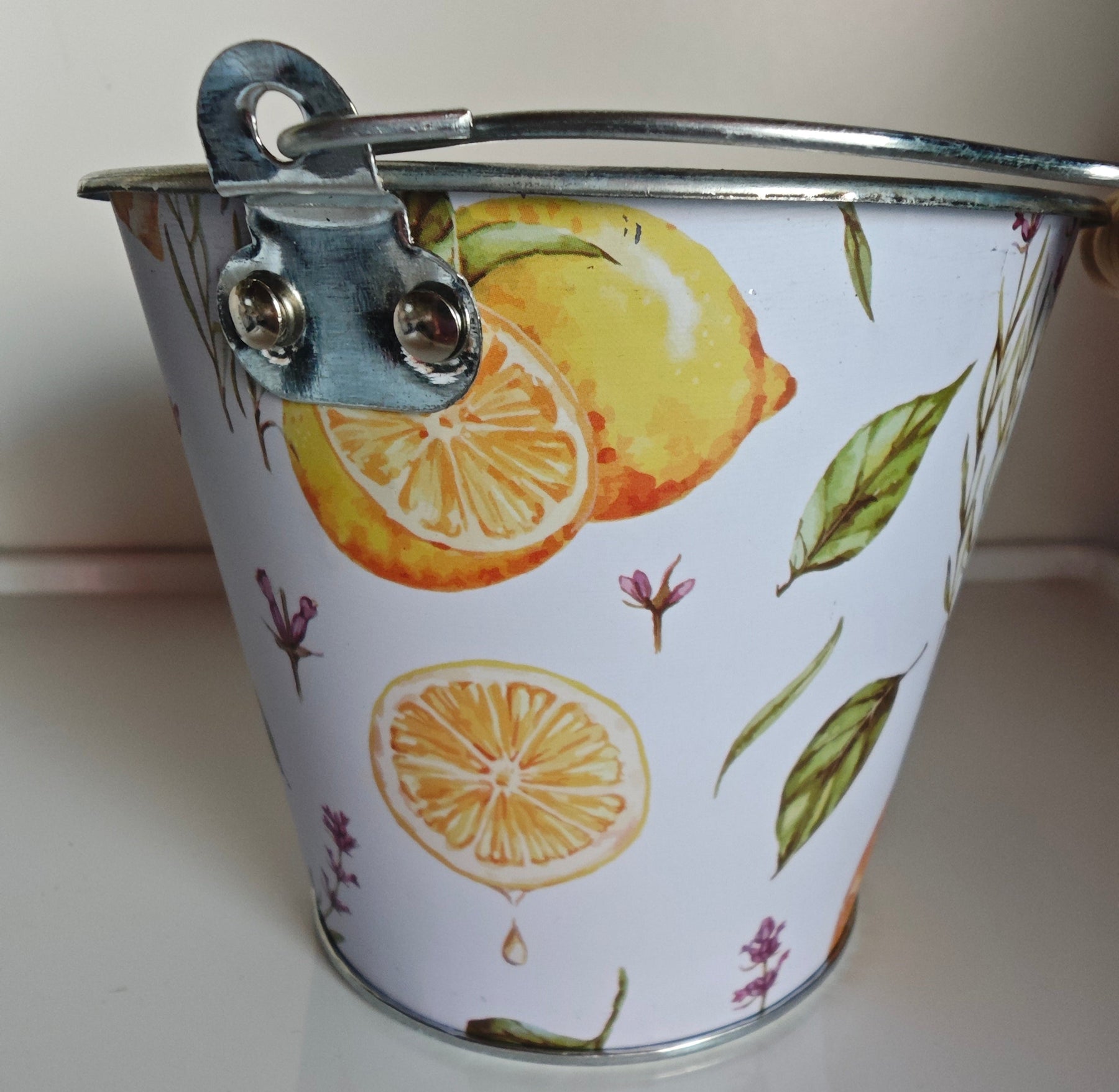 Blech-Pflanztöpfchen mit Henkel und Holzgriff , mit wunderschönen Zitr