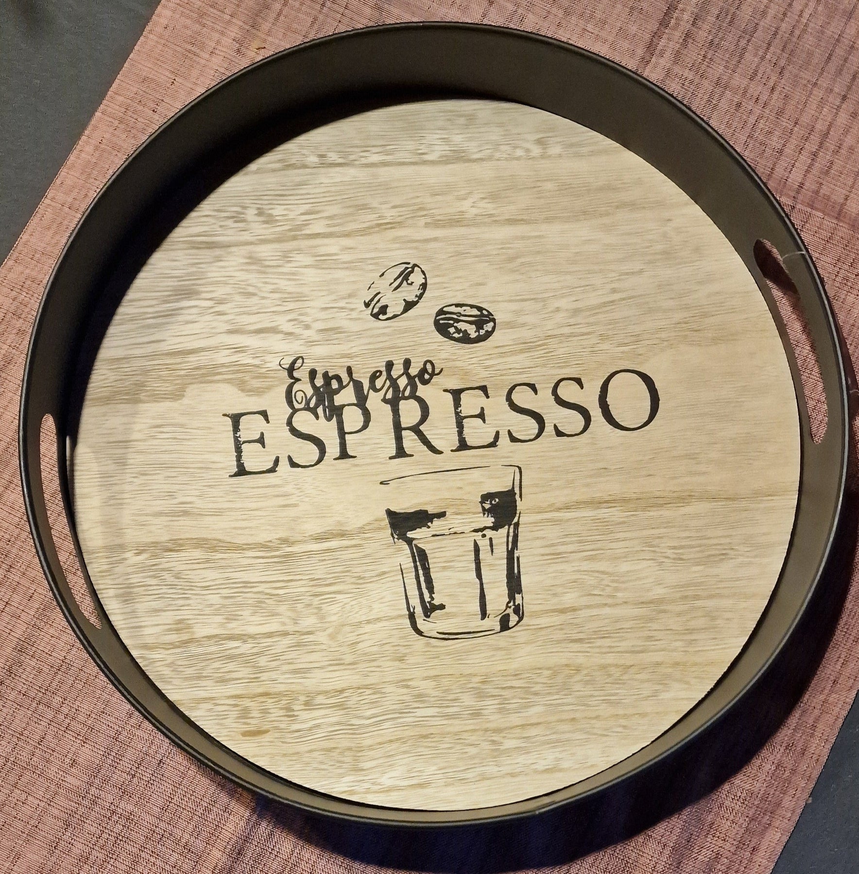 Serviere Deinen "kleinen schwarzen" mit italienischer Stimmung auf dem runden Serviertablett "Espresso". Hergestellt aus Holz und Metall in elegantem Schwarz, hat das Tablett einen Durchmesser von 31 cm.